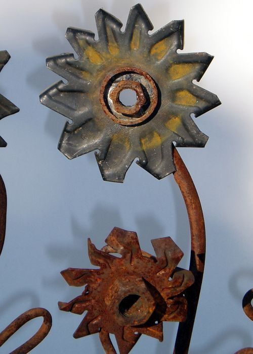 Bei näherem Hinsehen erkennt man alte Zahnräder, Eisenbahnschienen, Kugellager, Küchenteile, landwirtschaftlich genutzte Teile, solche, wie man sie kaum noch findet. Rost als natürliche Patina ist selbstverständlich und verleiht den Skulpturen eine organische Natürlichkeit, die sowohl im Freien als auch in Innenräumen gut zur Geltung kommt.