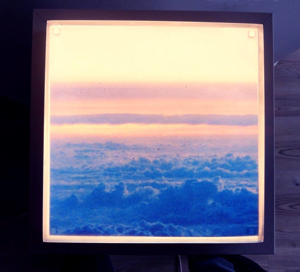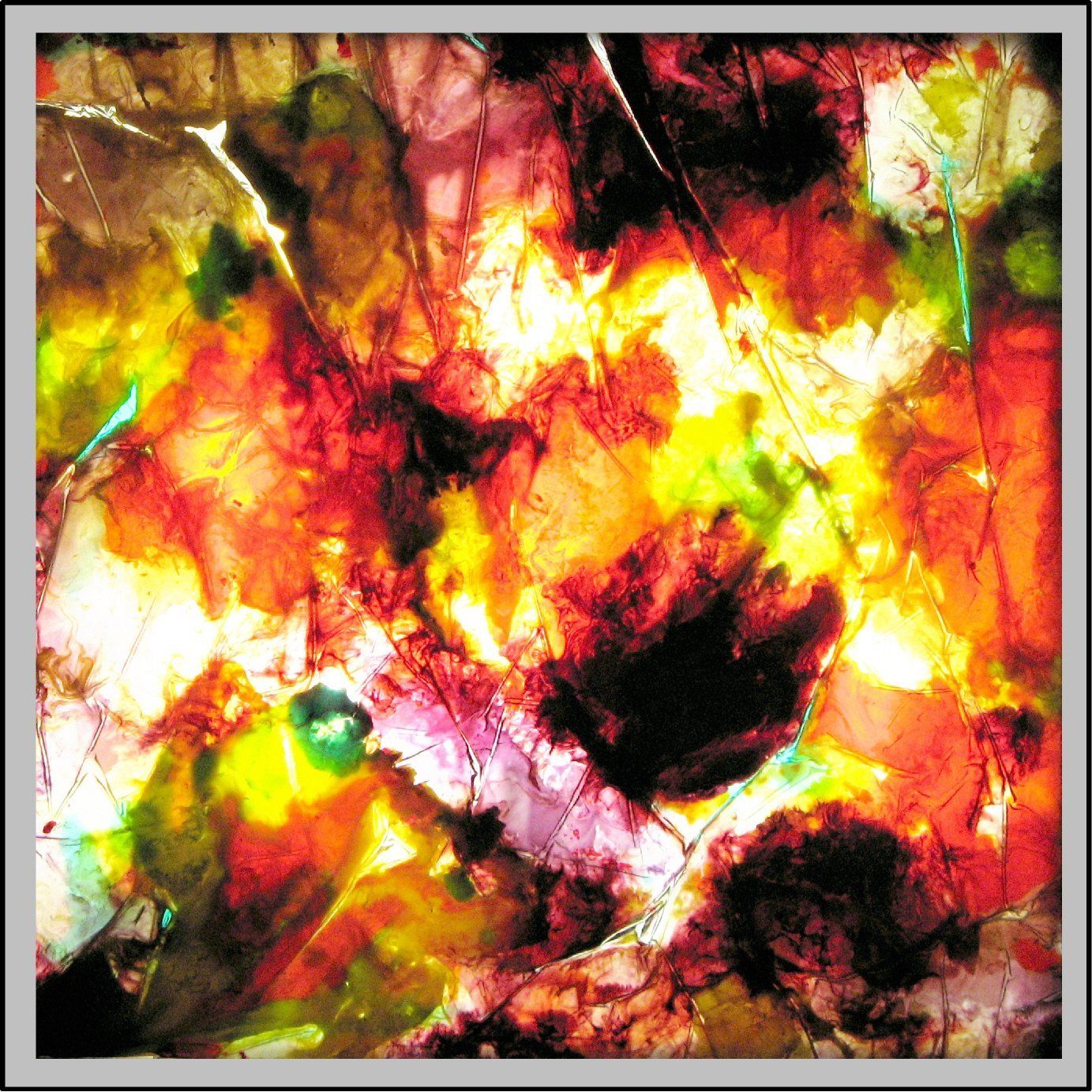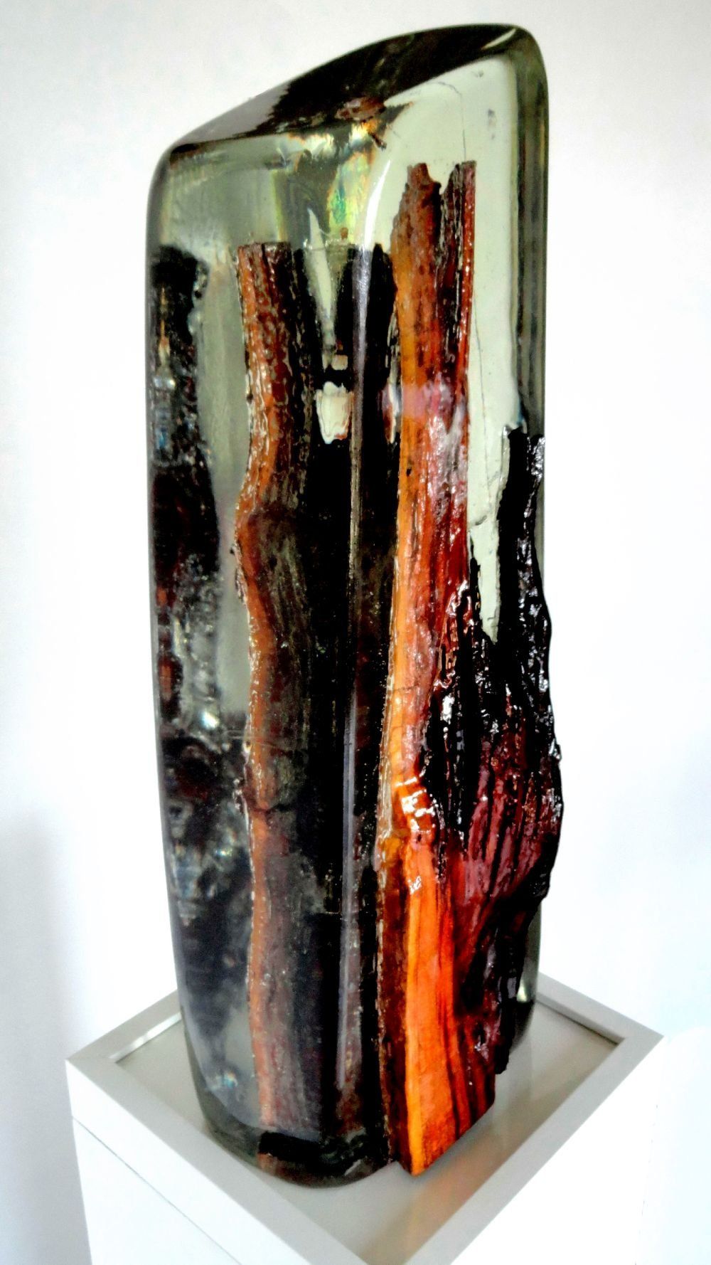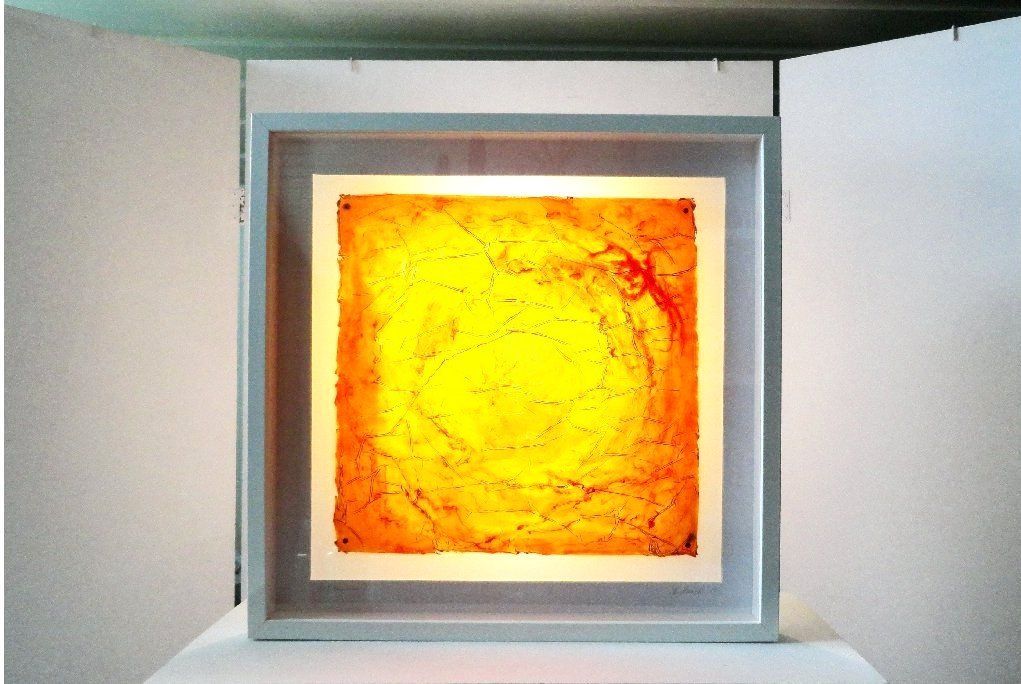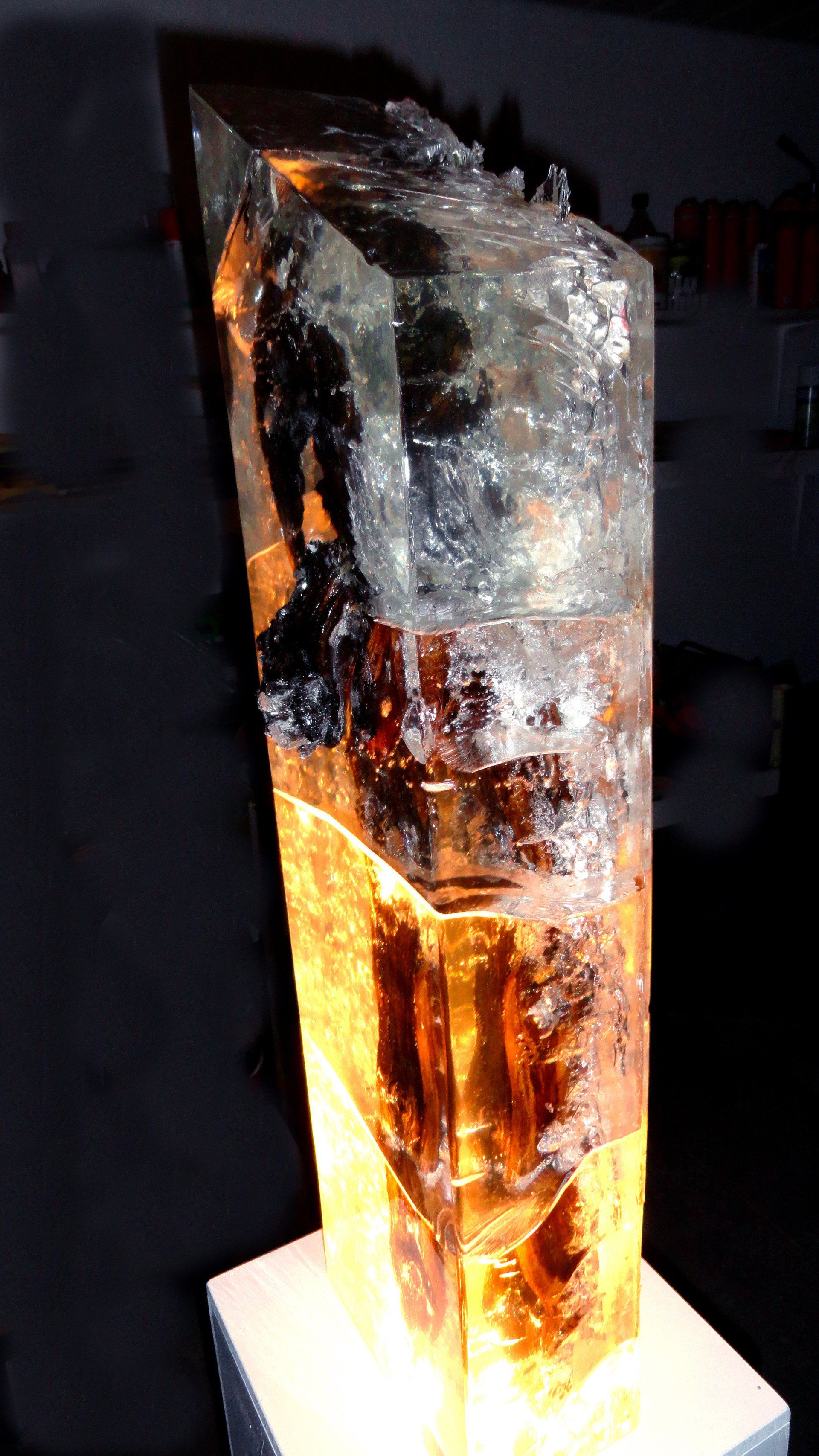 Die neuesten Lichtobjekte entstanden durch mehrere Harzschichten und intensiv- transparente Farbpigmente. Die Faszination dabei ist, dass sich bei Ein- oder Ausschalten der LED die Nuancierungen der Farben und Formen verändern.